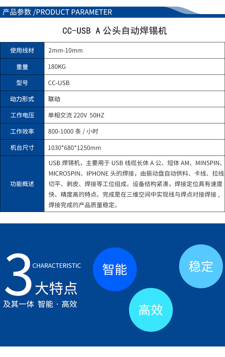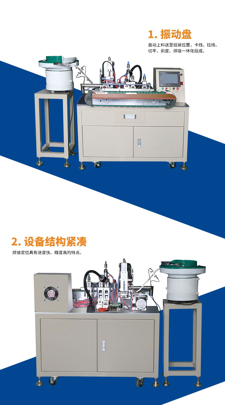 USB自動(dòng)焊錫機(jī),主要用于USB線纜長(zhǎng)體A公、短體AM、MINI5PIN、MICRO5PIN的焊接,由振動(dòng)盤自動(dòng)供料、再分線、拉線、切平、剝皮、