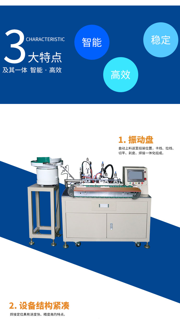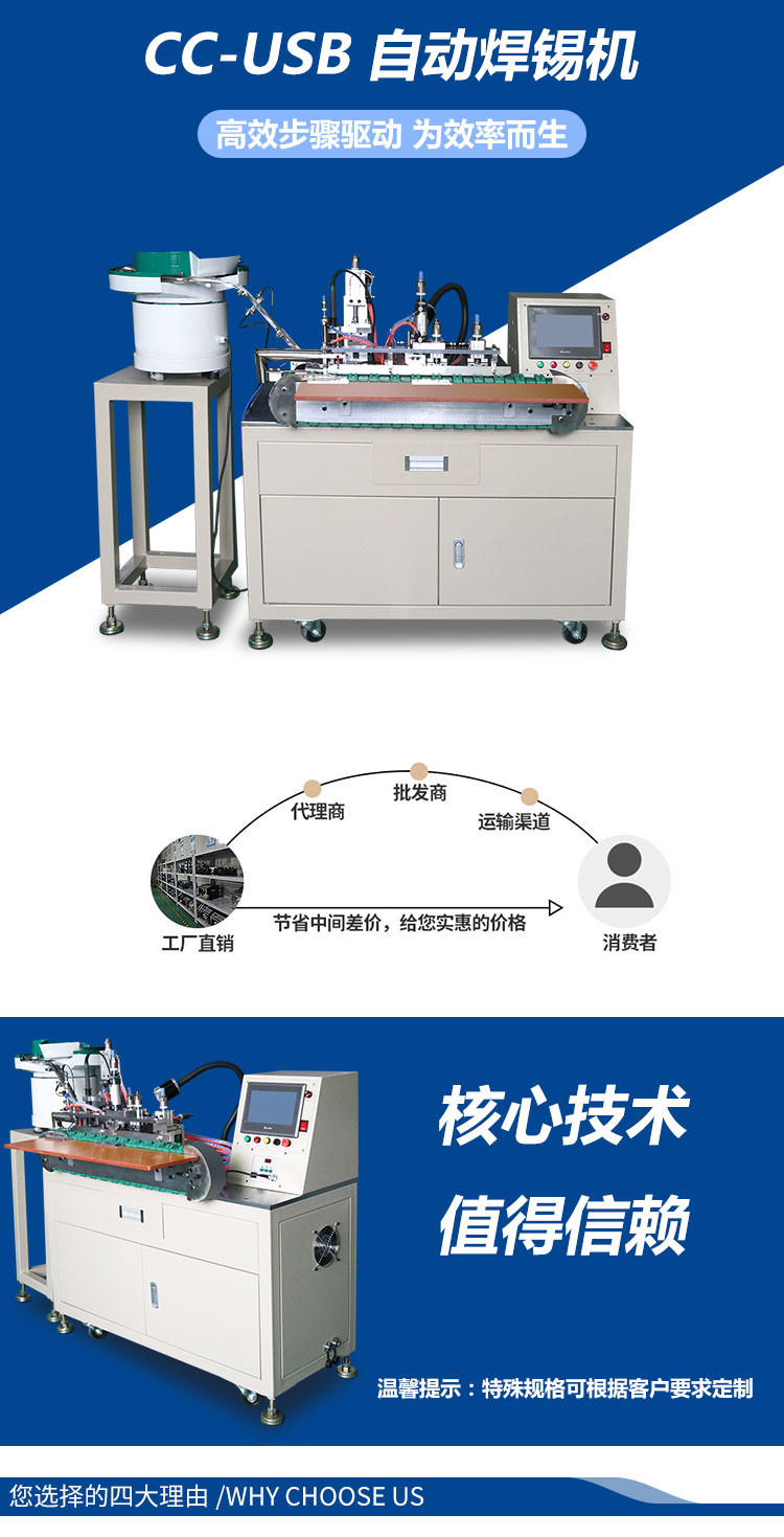 USB焊錫機(jī),主要用于USB線纜長(zhǎng)體A公、短體AM、MIN5PIN、MICRO5PIN、APPLE頭的焊接,由振動(dòng)盤自動(dòng)供料、卡線、拉線、切平、剝皮、焊接等工位組成。設(shè)備結(jié)構(gòu)緊湊,焊接定位具有速度快、精度高的特點(diǎn)。完成是在三維空間中實(shí)現(xiàn)線與焊點(diǎn)的對(duì)接焊接,焊接完成的產(chǎn)品質(zhì)量穩(wěn)定。