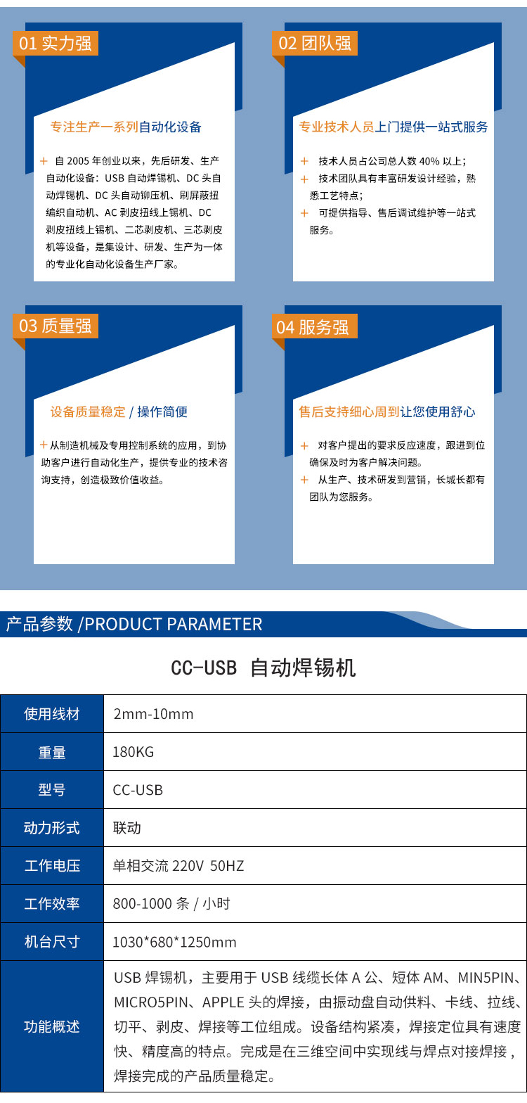 USB自動(dòng)焊錫機(jī),主要用于USB線纜長(zhǎng)體A公、短體AM、MINI5PIN、MICRO5PIN的焊接,由振動(dòng)盤自動(dòng)供料、再分線、拉線、切平、剝皮、