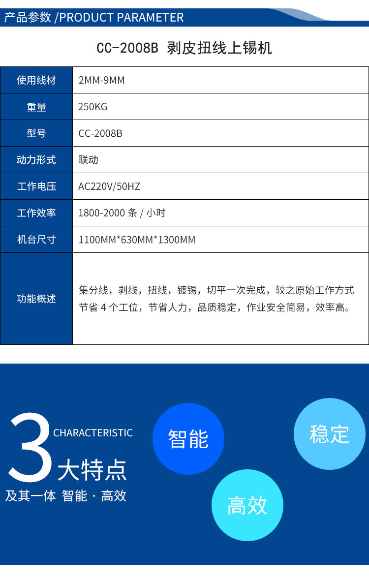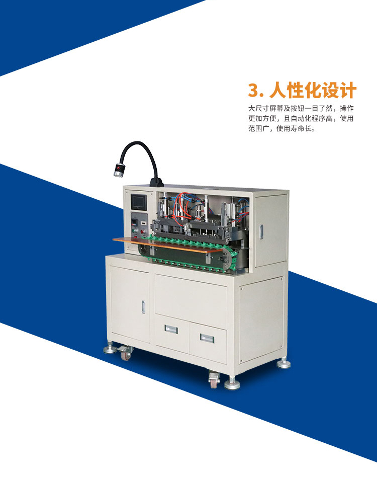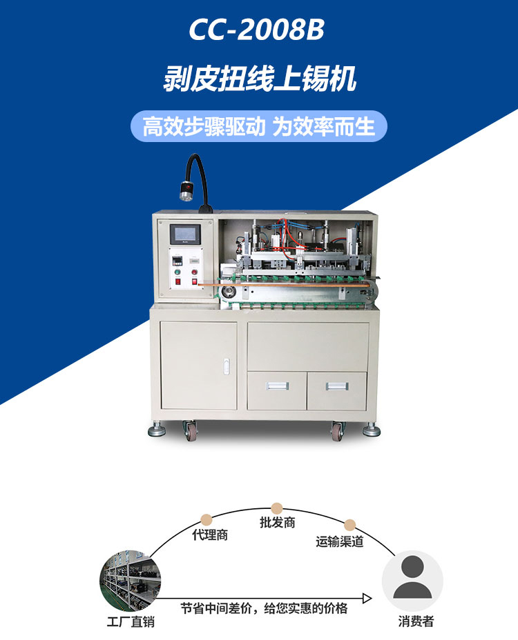產(chǎn)品介紹:集分線、剝線、扭線、鍍錫、切平、一次完成,品質(zhì)穩(wěn)定,操作簡單,效率高,較之原始工作方式節(jié)省4個工位,提高效率。